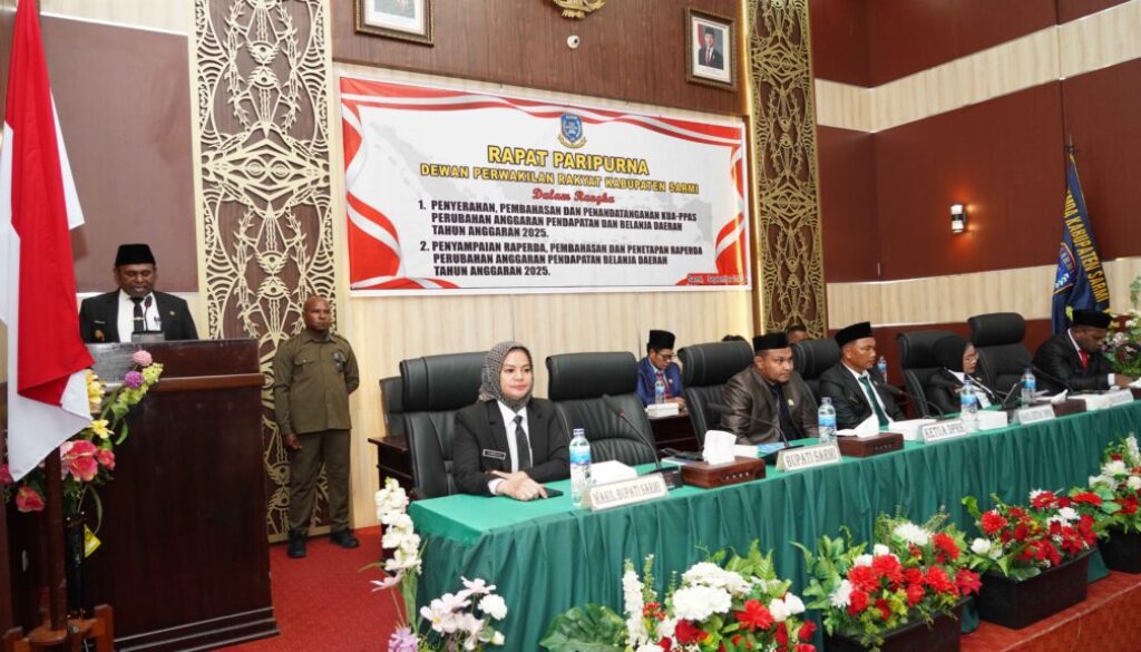 Petam, Kamis 11 September 2025 — Dewan Perwakilan Rakyat Kabupaten (DPRK) Sarmi melaksanakan lanjutan Rapat Paripurna dalam rangka pembahasan Kebijakan Umum Anggaran dan Prioritas Plafon Anggaran Sementara (KUA-PPAS) Perubahan Anggaran Pendapatan dan Belanja Daerah (APBD) Kabupaten Sarmi Tahun Anggaran 2025. Rapat paripurna tersebut dilaksanakan di Ruang Rapat Utama DPR Kabupaten Sarmi.